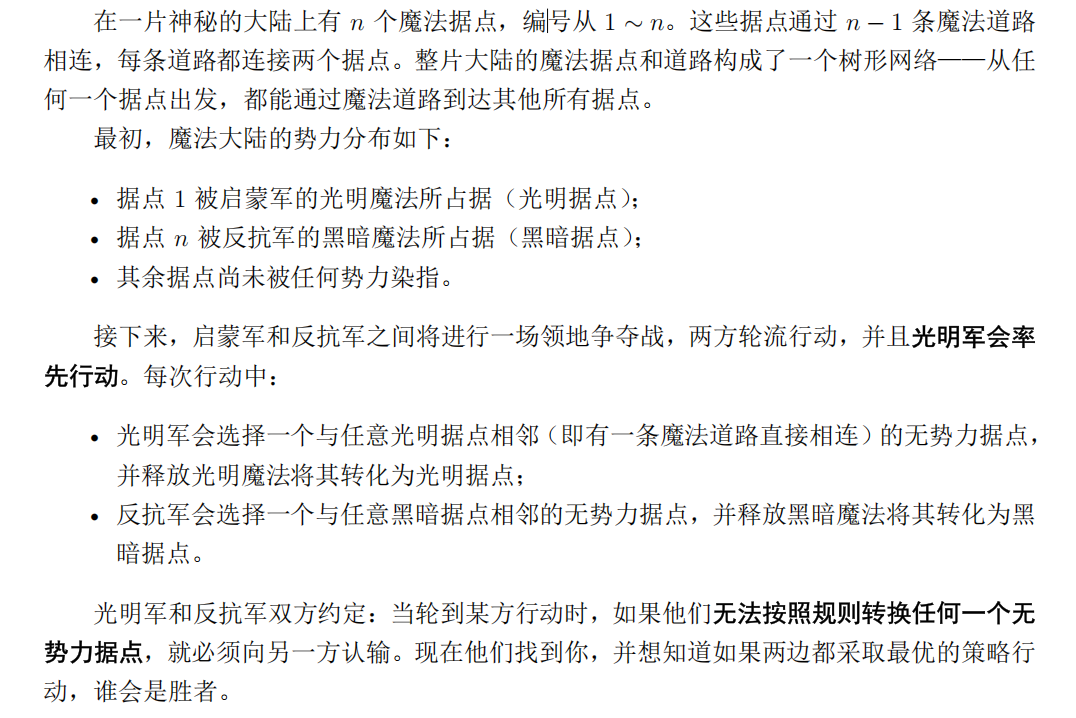 • 接下来 n − 1 行,每行两个整数 ai, bi,表示一条连接据点 ai 和 bi 的魔法道路。