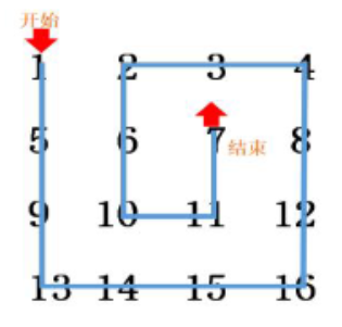 上图的数字线路为:1,5,9,13,14,15,16,12,8,4,3,2,6,10,11,7