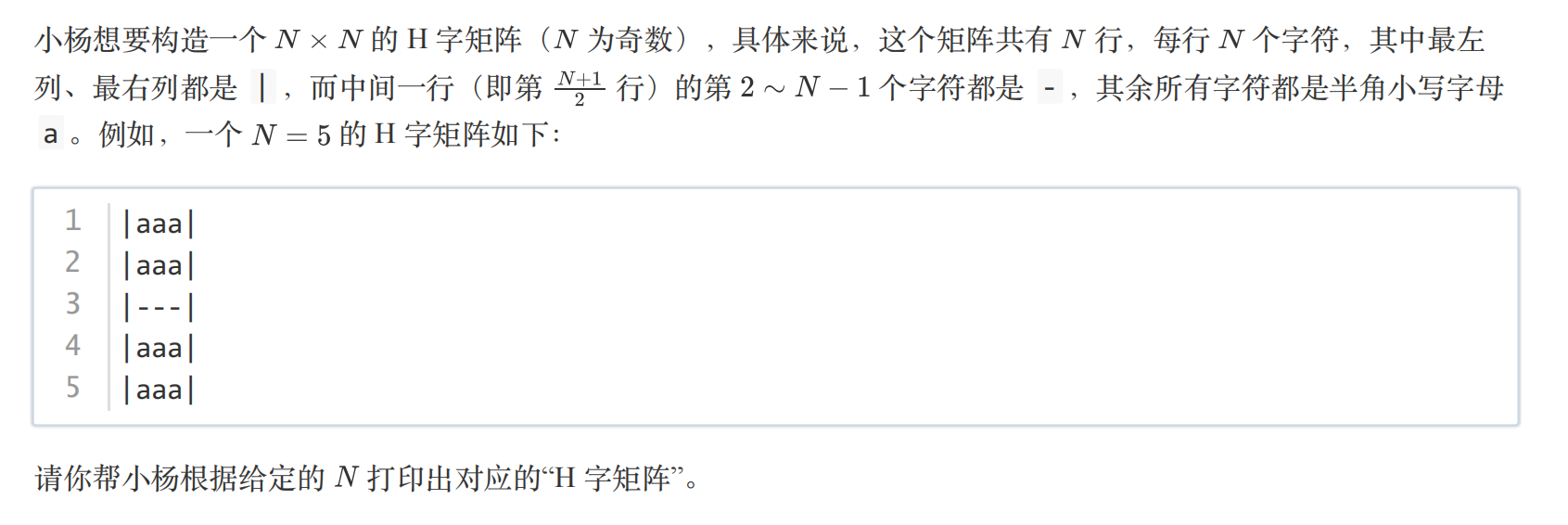 请严格按格式要求输出,不要擅自添加任何空格、标点、空行等任何符号。你应该恰好输出 N 行,每行除了换行符外恰好包含 N 个字符,这些字符要么是 - ,要么是 | ,要么是 a 。
