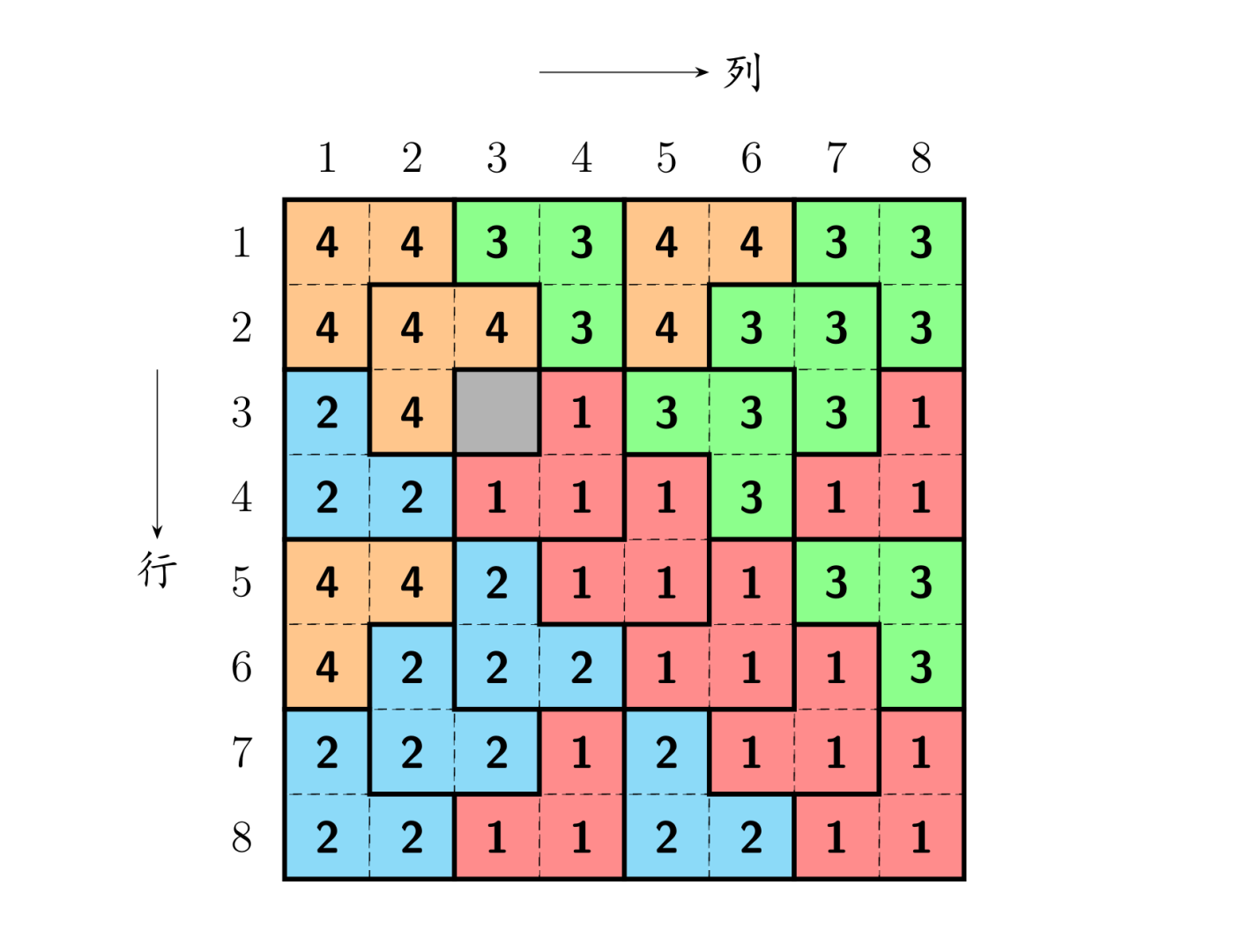 将迷宫填补完整的方案:每一补(行)为 ( 为毯子拐角的行坐标和列坐标, 为使用毯子的形状,具体见上面的图 ,毯子形状分别用 表示, 之间用一个空格隔开)。