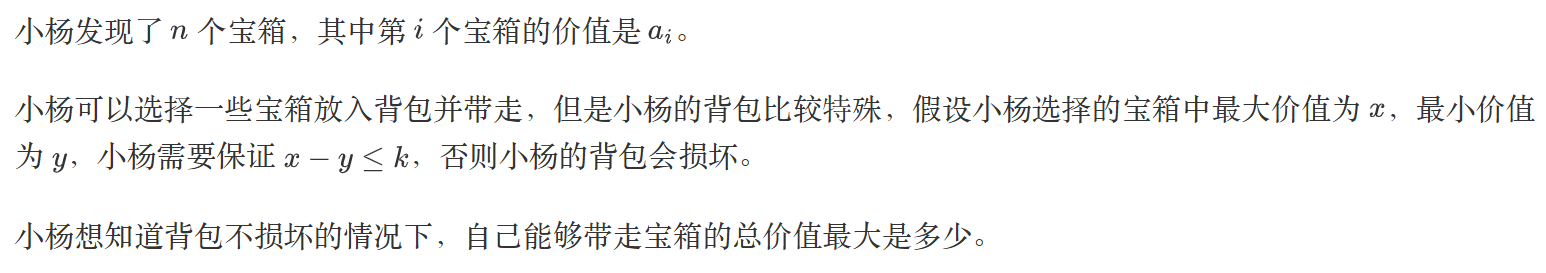 在背包不损坏的情况下,小杨可以拿走两个价值为 2 的宝箱和一个价值为 3 的宝箱。