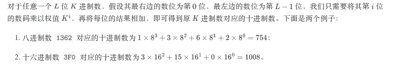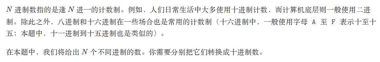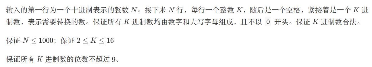 输出 N 行,每一个十进制数,表示对应 K 进制数的十进制数值。