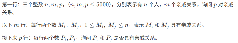 p 行,每行一个 Yes 或 No。表示第 i 个询问的答案为“具有”或“不具有”亲戚关系。