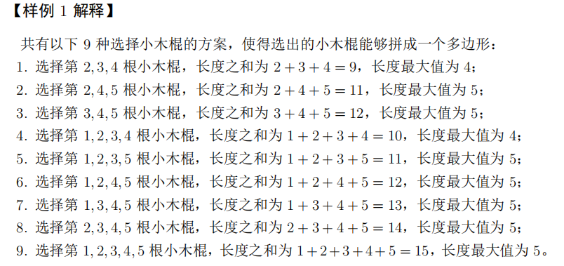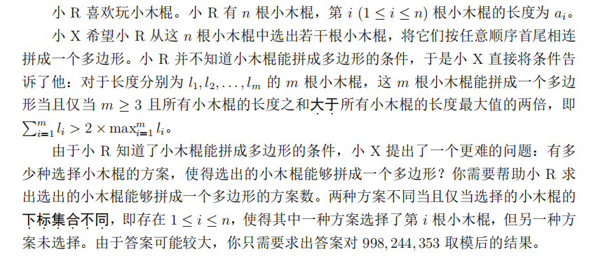 输出一行一个非负整数,表示小 R 选出的小木棍能够拼成一个多边形的方案数对998, 244, 353 取模后的结果。