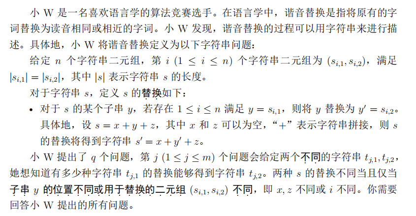 输入的第一行包含两个正整数 n, q,分别表示字符串二元组的数量和小 W 提出的问题的数量。
