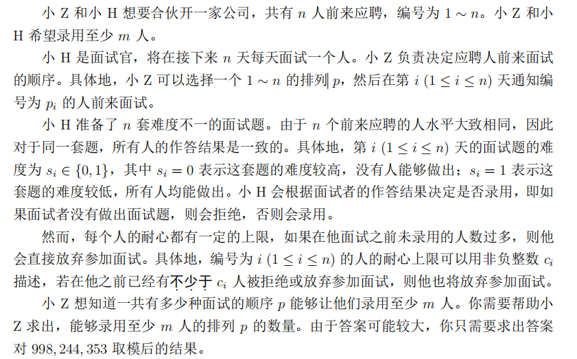 输出一行一个非负整数,表示能够录用至少 m 人的排列 p 的数量对 998, 244, 353取模后的结果。