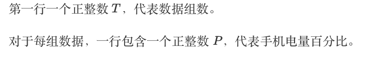 对于每组数据,输出一行,代表当前⼿机显⽰的电量信息。